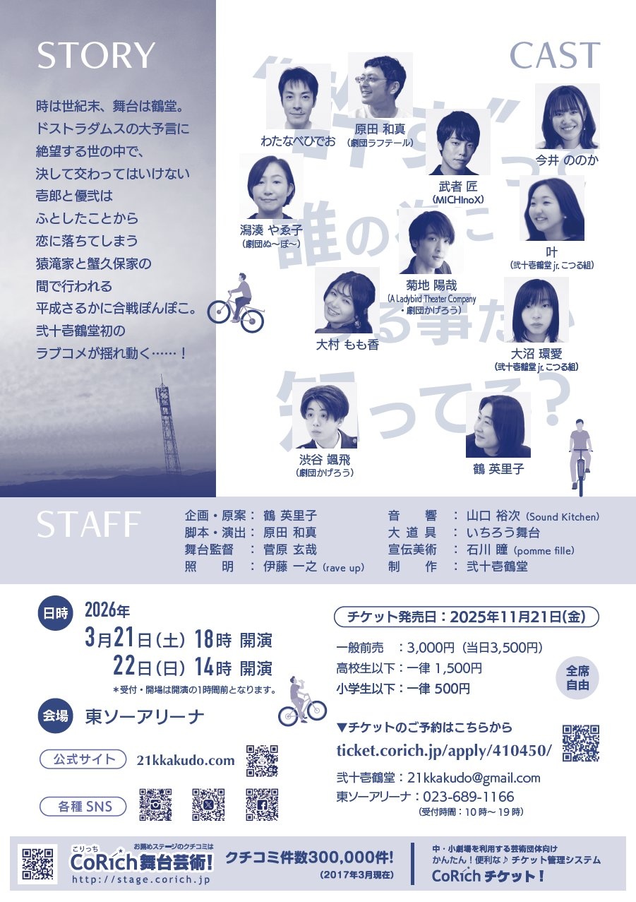 | 備考 | ※高校生以下の入場料は一律1,500円、小学生以下は一律500円 ※開場は開演の1時間前です。 公演のお問い合わせ先:弐十壱鶴堂 E-mail: 21kkakudo@gmail.com |